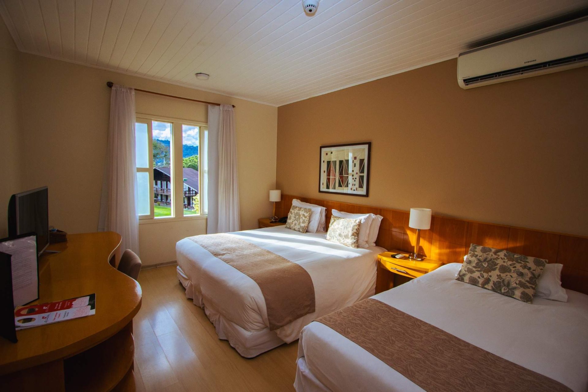Localizados em um dos chalés com arquitetura típica suíça e próximos de nosso gramado central, são espaçosos quartos com camas confortáveis, ar climatizado para todas as épocas do ano.